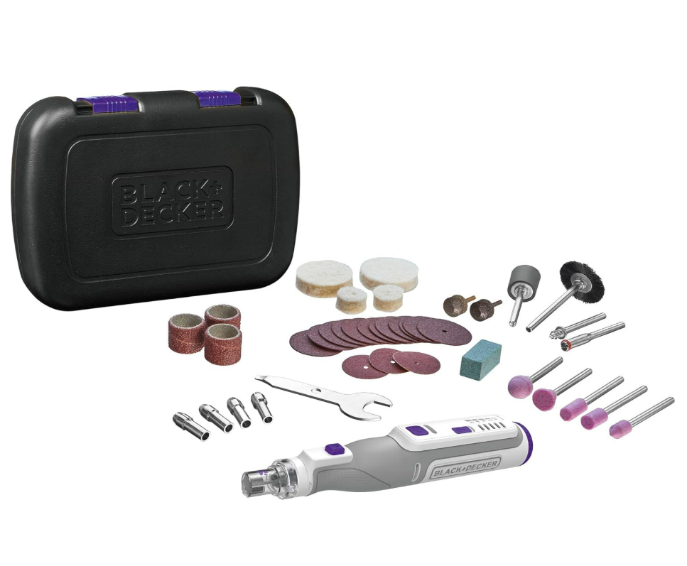The BLACK+DECKER 8V Cordless Rotary Tool has the power and runtime for a wide variety of household applications. Its powerful LED ring is perfect for use in dark areas and for when taking on more detailed tasks. It also has a five speed setting, allowing the user more intuitive speed control, whilst the USB charging port gives the ability to use any micro USB cords and plugs available. There’s a range of supporting accessories, offering the versatility to complete an even broader range of applications. Contains 35 accessories in a Kit Box.
