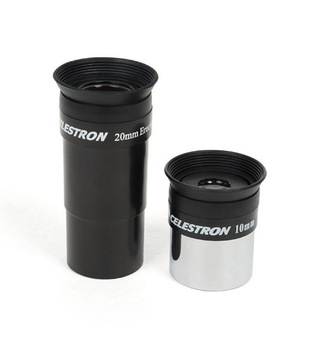 Accessories include a 20mm and 10mm eyepiece, a finderscope, a moon filter, a smartphone adapter, and a motor drive. The two eyepieces offer different magnifications for low and high powered views.
